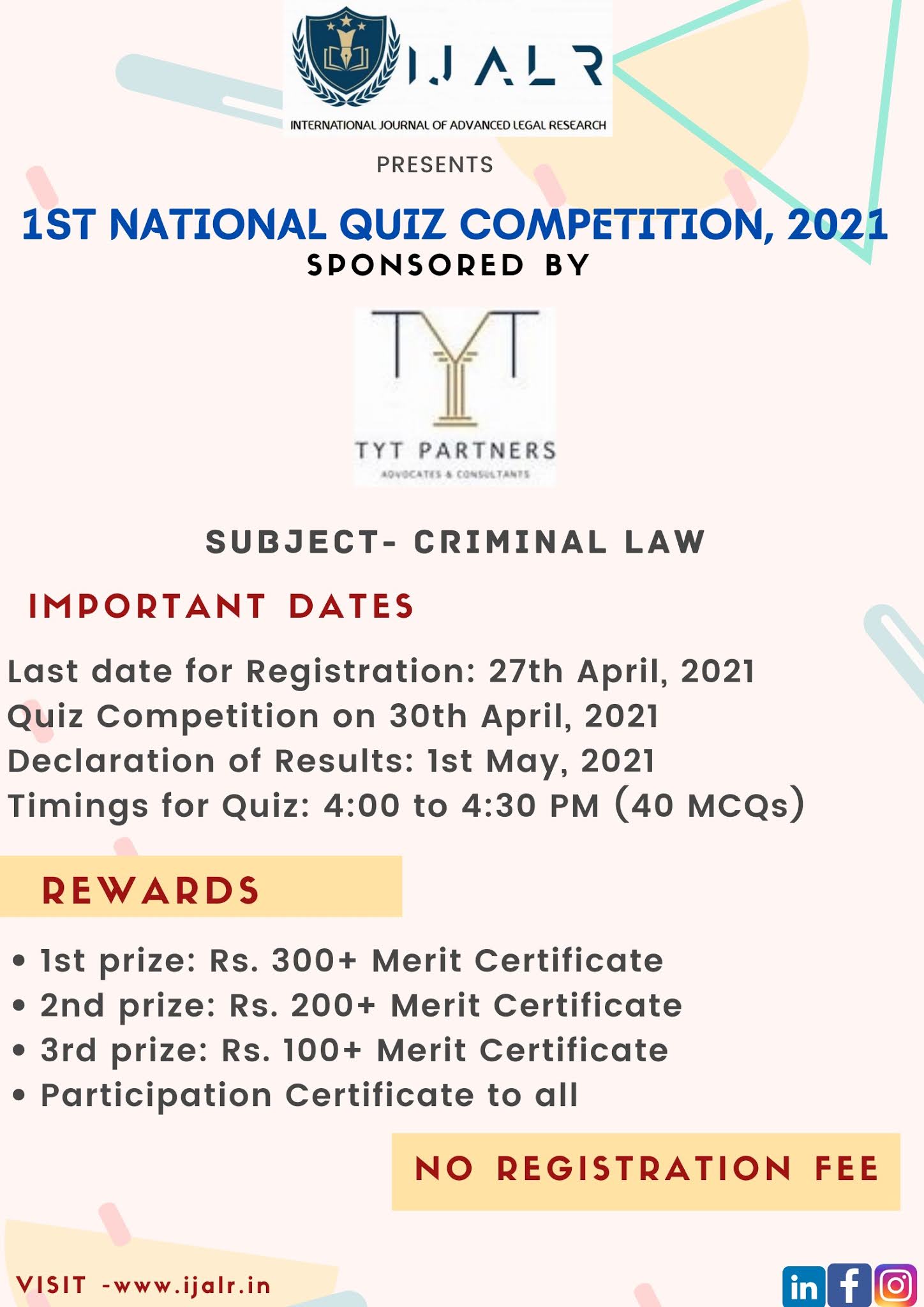 IJALR is organizing its 1st Online National Quiz Competition on Criminal Law scheduled to be held on 30th April 2021.