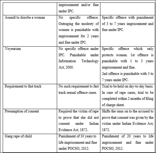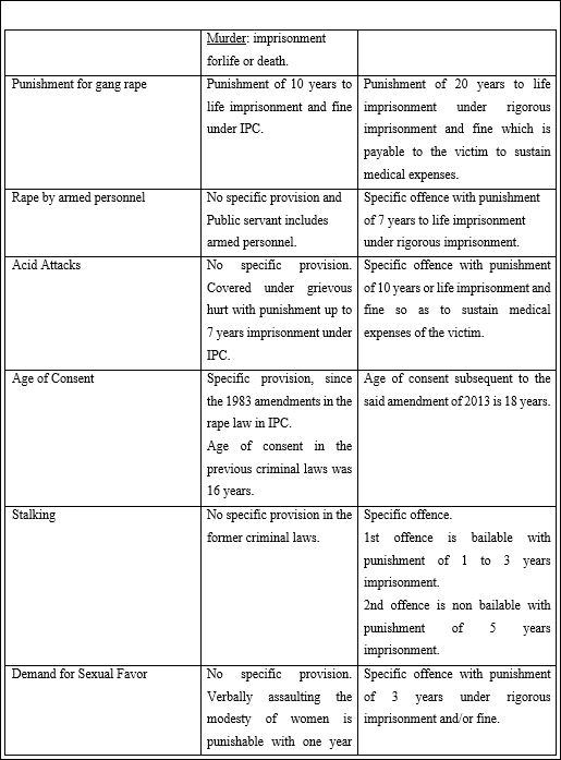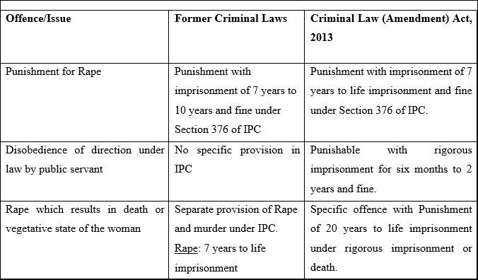 A committee known as the Justice J.S. Varma Committee[13] was framed to consider the recommendations in the amendment of the criminal laws. The tabular representation outlines some of the differences between the criminal laws prior and subsequent to the Criminal law (Amendment) Act, 2013 with respect to Section 376 of IPC