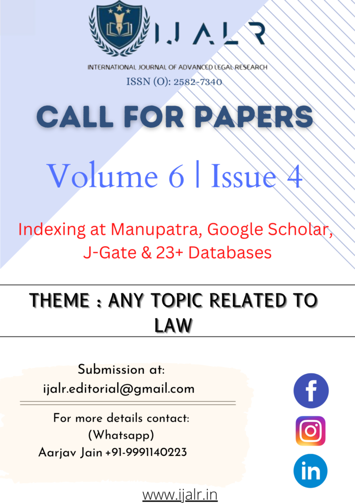 International Journal of Advanced Legal Research (IJALR) is an international, quarterly, peer-reviewed, online journal that provides an interactive platform for the publication of short articles, long articles, book reviews, case comments, research papers, and essays in the field of Law.