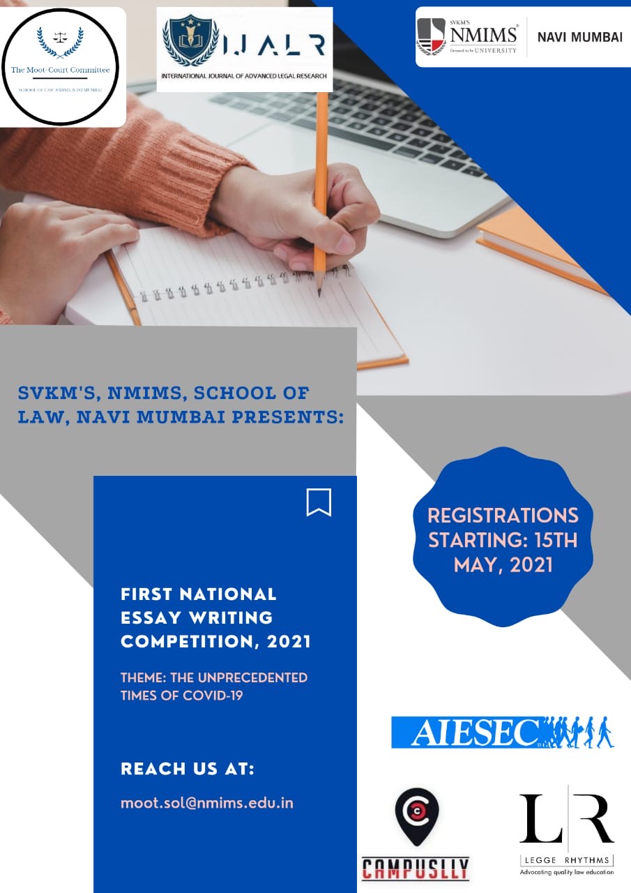 · The pandemic has affected people from all levels of life, some people have lost their jobs, some have even lost their beloved family members. In these troubling times, it is important to engage in fruitful activities and one of the ways to do this would be to participate in online events. Hence, the Moot-Court Committee of SOL NMIMS, Navi Mumbai has decided to conduct the 1st National Essay Writing Competition and the theme of the competition is “THE UNPRECEDENTED TIMES OF COVID-19” whichencompassestopics that bring the discussion of COVID-19 to the forefront thereby spreading awareness and is a perfect way of engaging into something fruitful by appropriately putting your wits to the test. We believe that we will be able to create a platform of knowledge, focusing on stimulating discourse in the socio-legal field while also offering a substantial contribution to the fields of legal, social, environmental, political, commercial, and worldwide concerns.