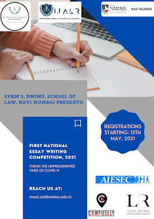 SVKM’s NMIMS, School of Law, Navi Mumbai brings to you our First National Essay Writing Competition, 2021.The objective of this event is to develop a platform of excellency through diverse opinions of brilliant minds sitting at home and willing to spread their word and bring the discussion of important topics pertaining to COVID-19 to the forefront.