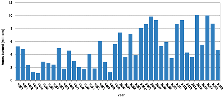 Annual Number of Acres Burned in Wild Fires in between 1980-2019 in the US: